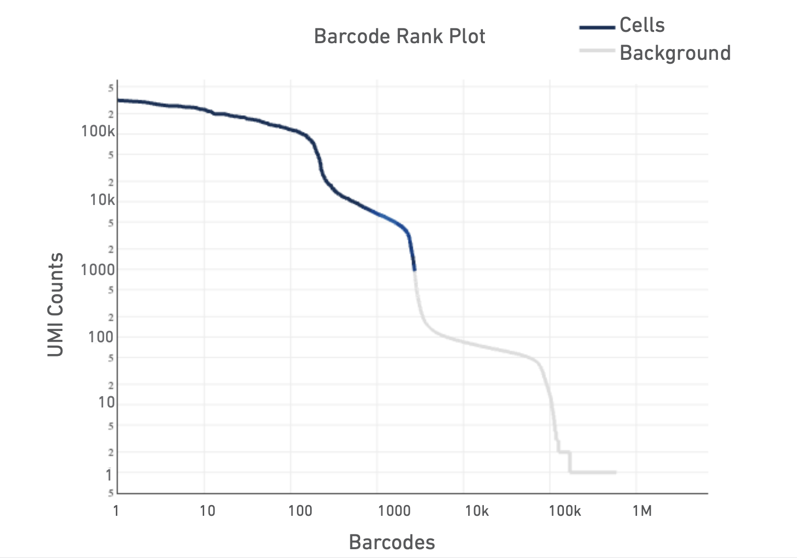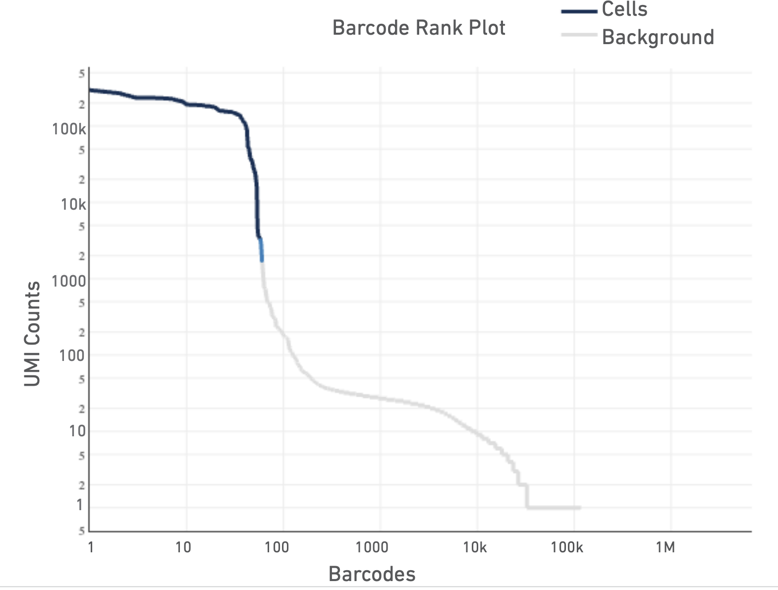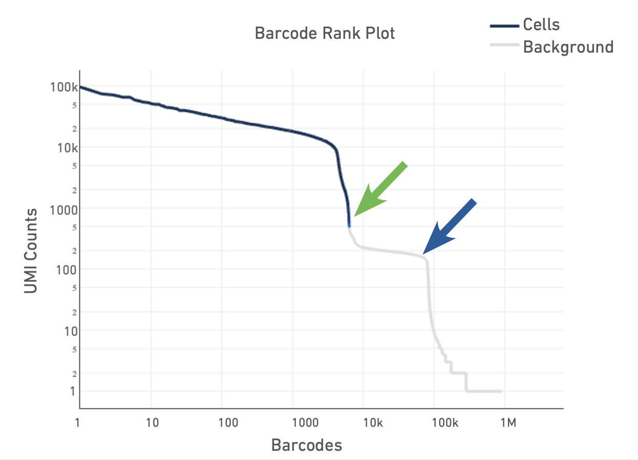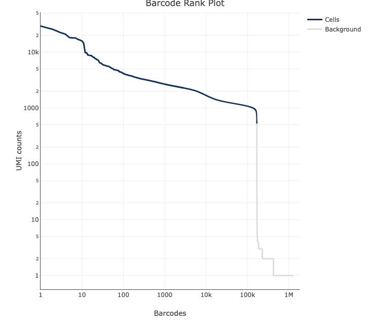 The Barcode Rank Plot is an interactive plot that shows all barcodes detected in an experiment, ranked from highest to lowest UMI count. It is useful for understanding Cell Ranger’s cell calling algorithm to gain insight into your sample quality.
