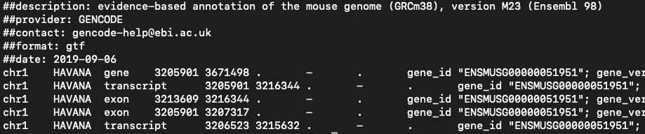gunzip -f Homo_sapiens.GRCh38.dna.primary_assembly.fa.gzGTF (Gene Transfer Format)