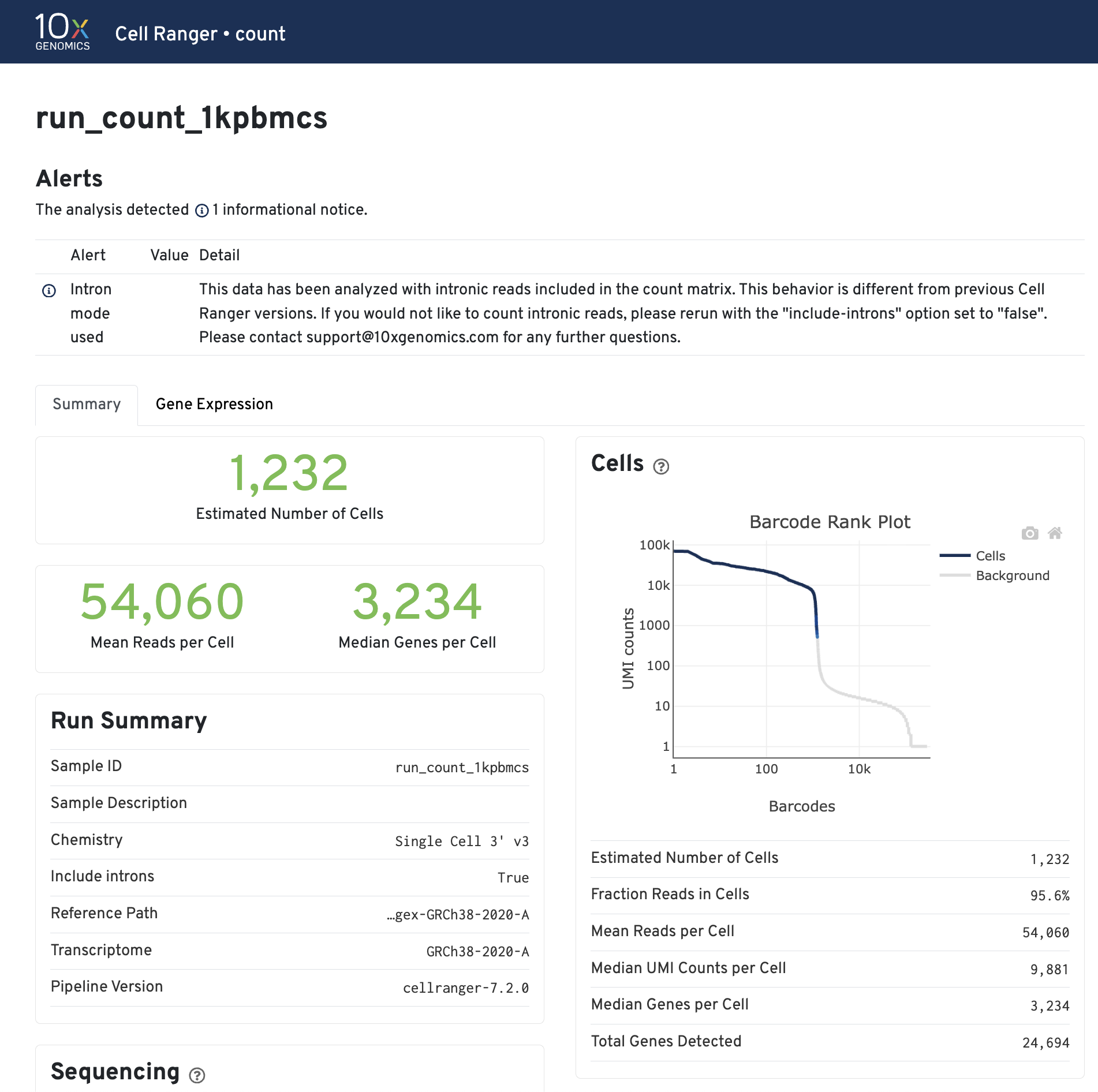 The cellranger count pipeline outputs an interactive summary HTML file named web_summary.html that contains summary metrics and automated secondary analysis results. It has Summary and Gene Expression tabs. For a general intro you can read this link here.